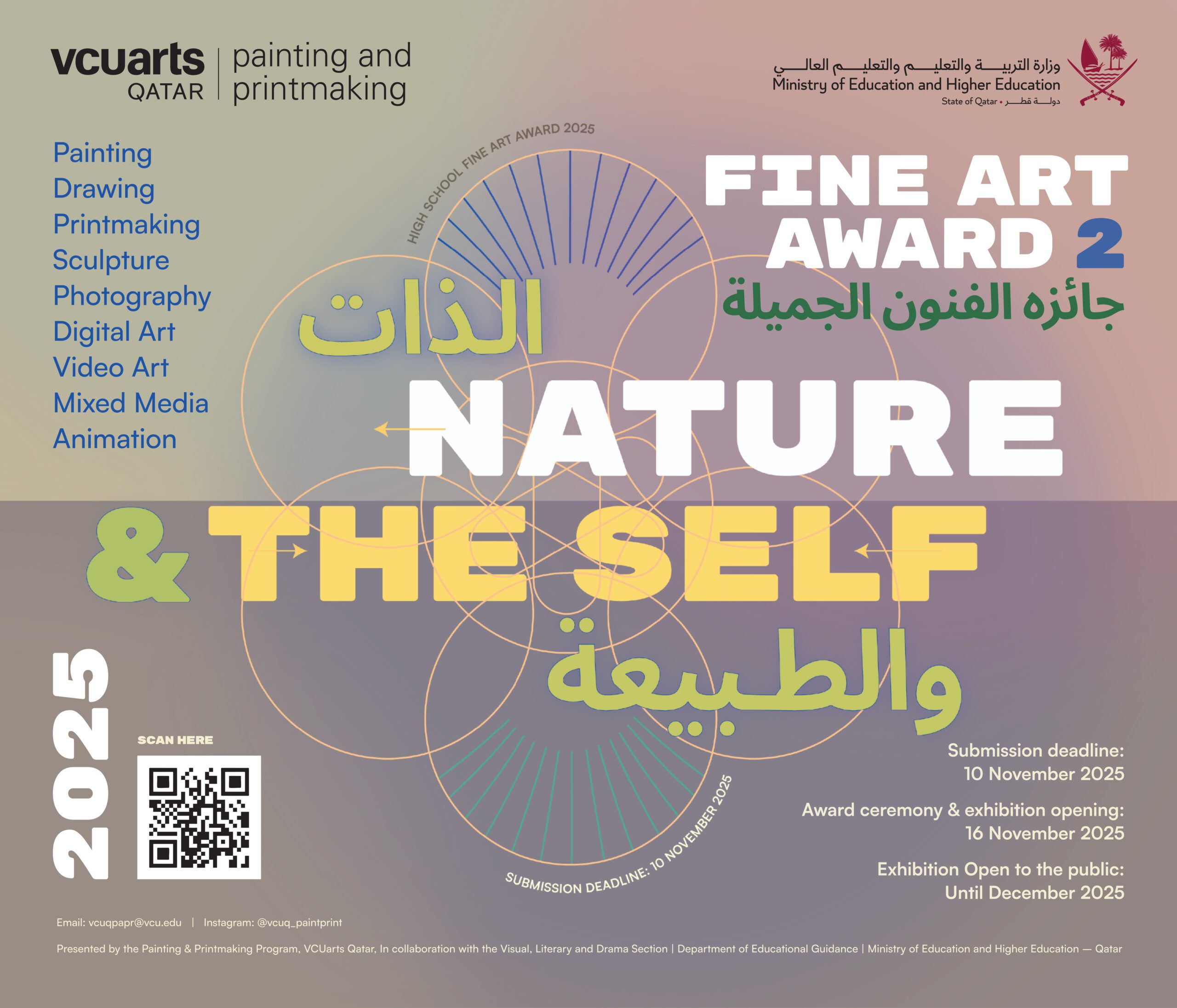 The Painting & Printmaking Program at VCUarts Qatar, in collaboration with the Visual, Literary and Drama Section | Department of Educational Guidance The Ministry of Education and Higher Education – Qatar, is proud to announce the second edition of the High School Fine Art Award, themed Nature & the Self.